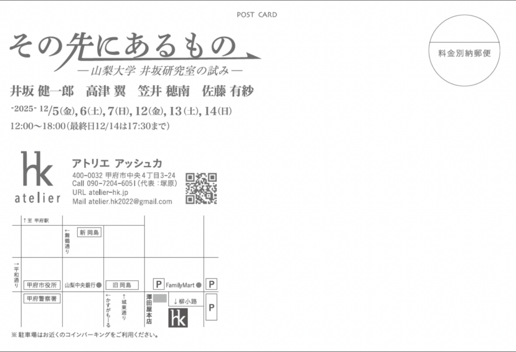 このたび教育学部 井坂研究室では、教員と学生の日頃の研究成果の発表として美術展「その先にあるもの -山梨大学 井坂研究室の試み-」を開催いたします。この美術展には井坂健一郎教授と井坂研究室のゼミ生3人が出品し、絵画、インスタレーション、マンガ、CGなど多岐にわたる表現をご覧いただけます。入場無料。皆様のご来場をお待ちしております。